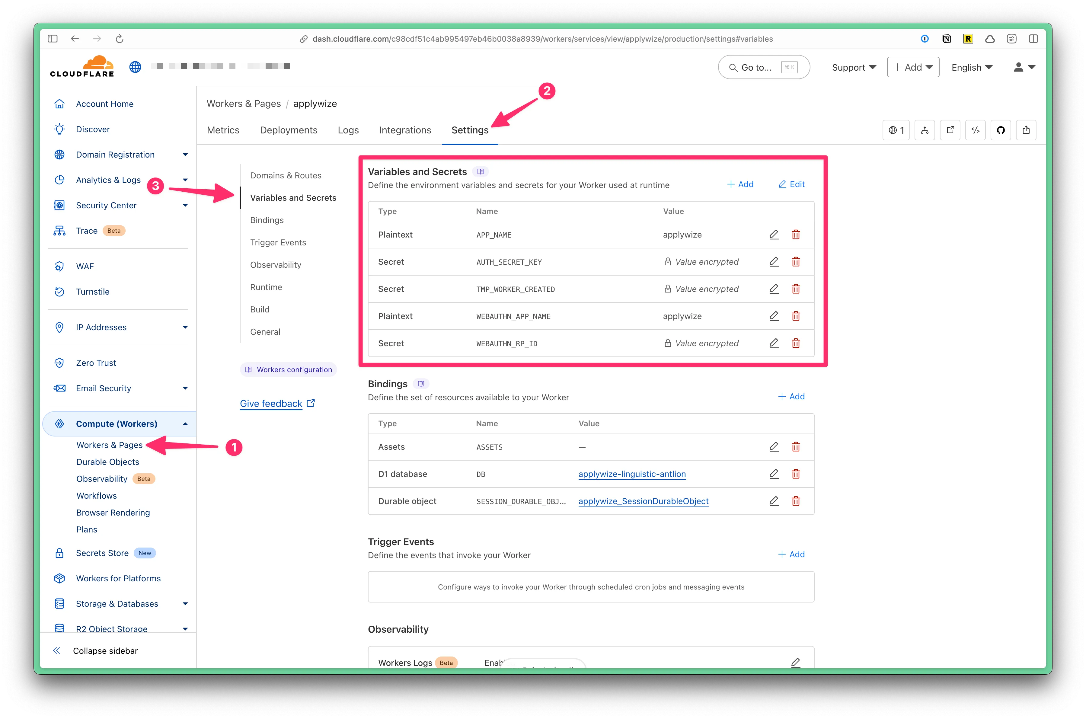 npx wrangler secret put <KEY>Then, the CLI will prompt you to enter the secret value.