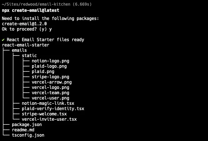 Section titled “Installation”Install the React Email components to your project by running the following command in the Terminal: